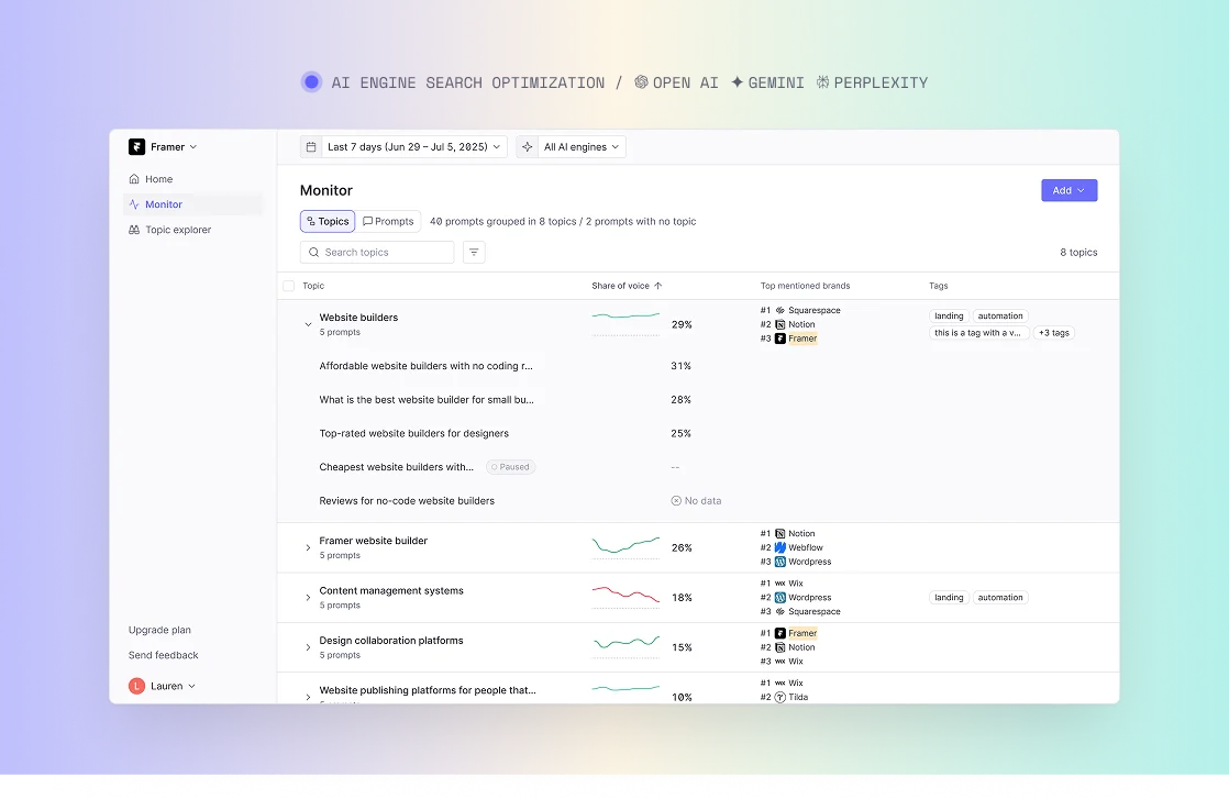 Omnia es una plataforma que muestra exactamente dónde y cómo tu marca aparece en motores de búsqueda de IA como ChatGPT, Perplexity, Google AI Overviews y Google AI mode.